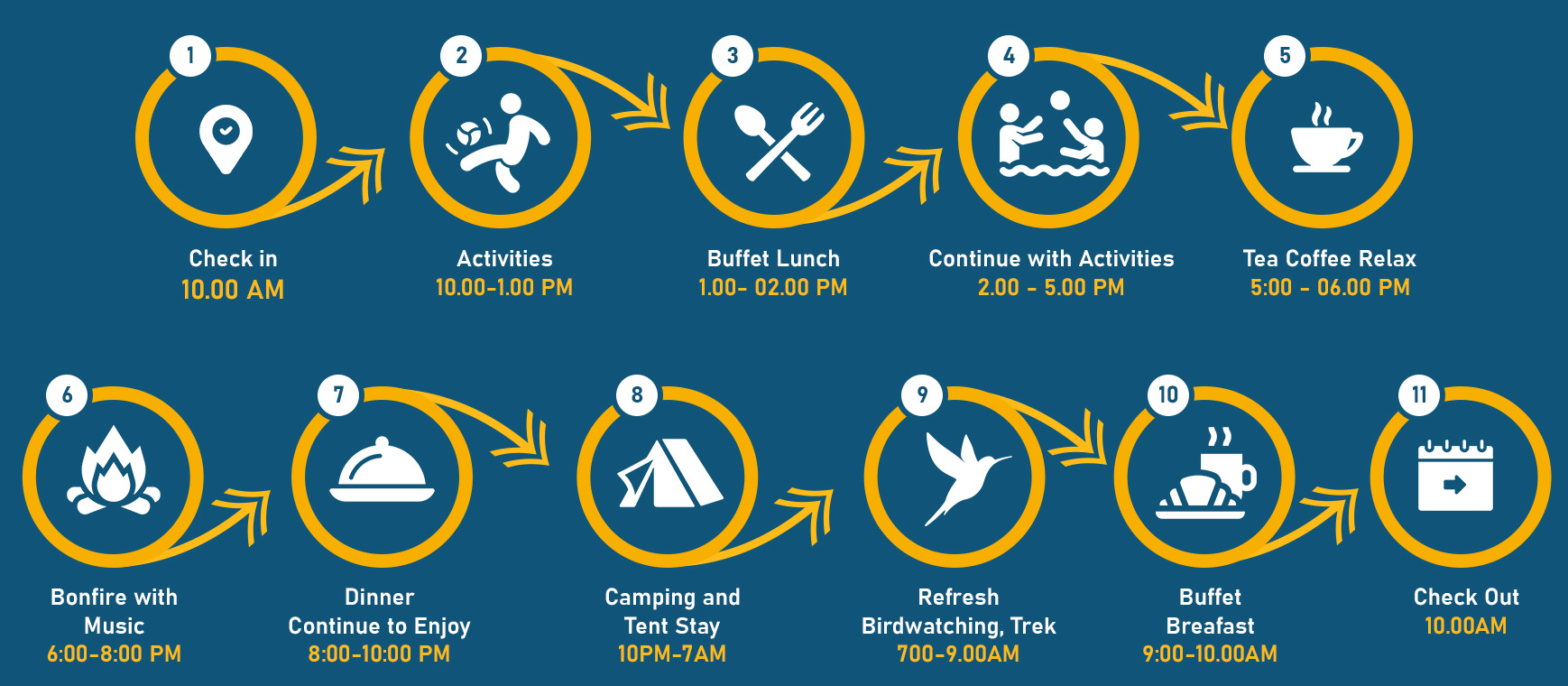 Rest easy in our cozy and secure accommodations while our dedicated staff ensures your safety and comfort throughout your stay. Join us for an unforgettable camping experience where campfires, dance, music, great food, and security blend seamlessly with nature’s beauty. Book your stay today and create lasting memories.